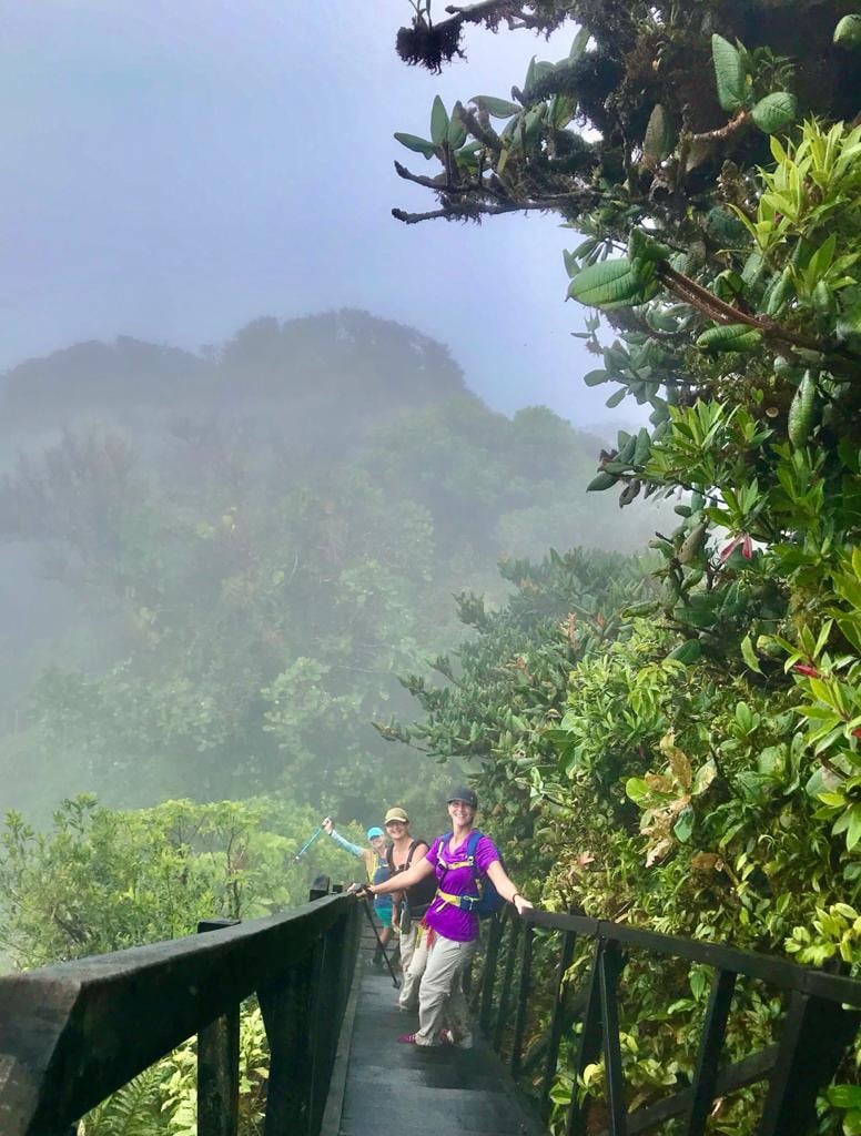 After two hours (this would be less without picture taking), we arrived at wooden stairs that led to a large wooden platform. We were at close to 4,000 feet in elevation. We were in the clouds with just a glimpse of a view ahead of us. Heavy wind blew us here and there on the platform. Yisel told us there would be more chance of a clear day in late March and April. We enjoyed a much needed water and snack break that came with quite a bit of chilly and misty air. Some sought a bit of shelter from the wind and cold by leaving the platform and sitting on the steps below. It is a good idea to wear layers for this hike. Soon after snacking, we started the descent, and, with the clouds clearing and thinning out somewhat, we could see we were above the trees. The scenery changes quickly on the platform. We saw tall trees ahead of us, and there was now a heavy mist of rain. I only realized how wet it was when I noticed my friend’s ponytail was very damp. Another good idea is to wear a tight fitting hat, baseball cap and/or poncho.